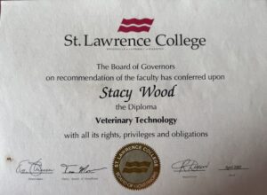 The rest of my schooling career remained a struggle. I went on to graduate high school taking all Advanced level courses. I fought with everything I had to keep myself from failing. When my parents became frustrated over my school marks and my father used verbal negative reinforcement to push me, it was Mr. Molloy’s words, that sustained my perseverance. As I went to St. Lawrence College and all my theory classes barely made the passing grade, I would remind myself, “It just might take me a little longer to get the right answer.” When I received near perfect marks for each college lab assignment, I remembered Mr. Molloy saying to me “You are actually very smart…You just proved that!” In 2002, I graduated from college with a Diploma in Veterinary Technology.